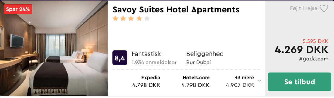 Du får generelt ret meget for pengene i Dubai, når det gælder hoteller, og der er mange at vælge imellem. Det er ikke svært at finde f.eks. et 5* hotel til under 3000 DKK pr/person for en uge. Jeg har imidlertid, for at komme længere ned i pris, fundet et super lækkert 4* hotel, der er beliggende tæt på Burj Khalifa og Dubai Mall. En uges ophold her, kan du få, for bare 2135 DKK/prs.