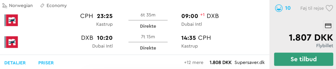 En Standard billet til Dubai, koster nemt over 2100 DKK tur/retur, hvis du vil flyve direkte. Men fra november 2019 til og med januar 2020, har jeg fundet en del datoer, hvor billetterne koster fra 1800-1950. Dermed kan du spare op til omkring 30%, så det er et pænt tilbud. Se alle mine datoforslag nederest i indlægget.