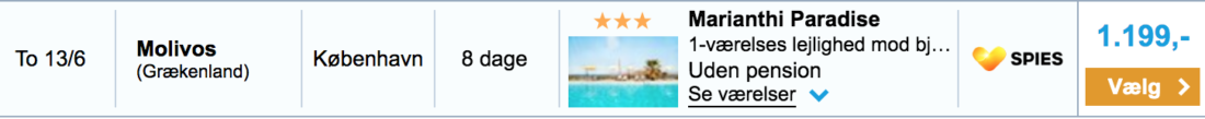 Kunne du lige trænge til en spontan tur til varme himmelstrøj? Så har jeg her fundet en last minute deal, hvor du får en uge på den græske ø Lesbos, der ligger ud for den tyrkiske vestkyst, for blot 1199 DKK/prs. inklusiv både fly og hotel. Det er ret billigt sluppet. En uge på de græske øer med hotel of fly i højsæsonen kan nemt løbe op i over 3000 DKK, og 4000 DKK i skolernes sommerferie.